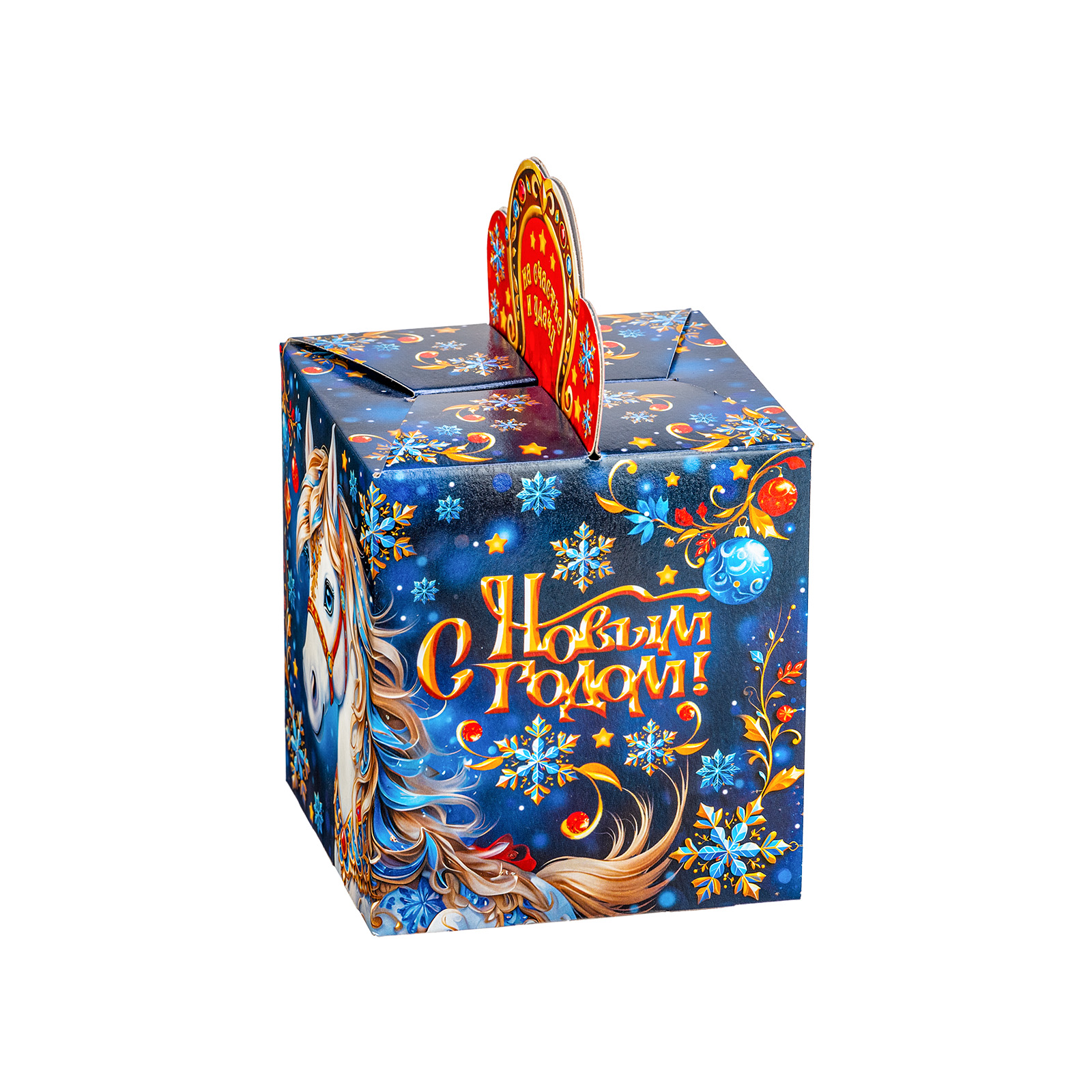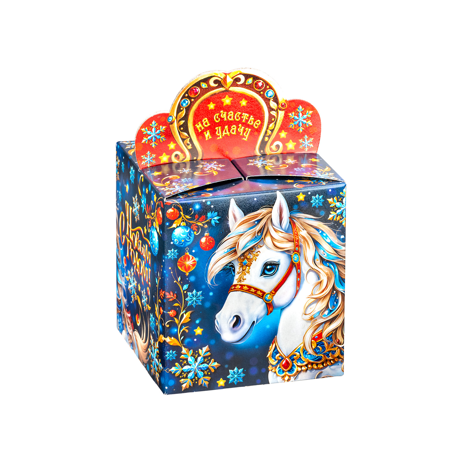 Интересный вариант новогоднего подарка – «Калейдоскоп удачи». Он представлен в разделе Картон. Отлично подойдет на подарок в 2026 году с символом Лошадь. Внутри такого презента находится кондитерский набор весом 300 граммов.