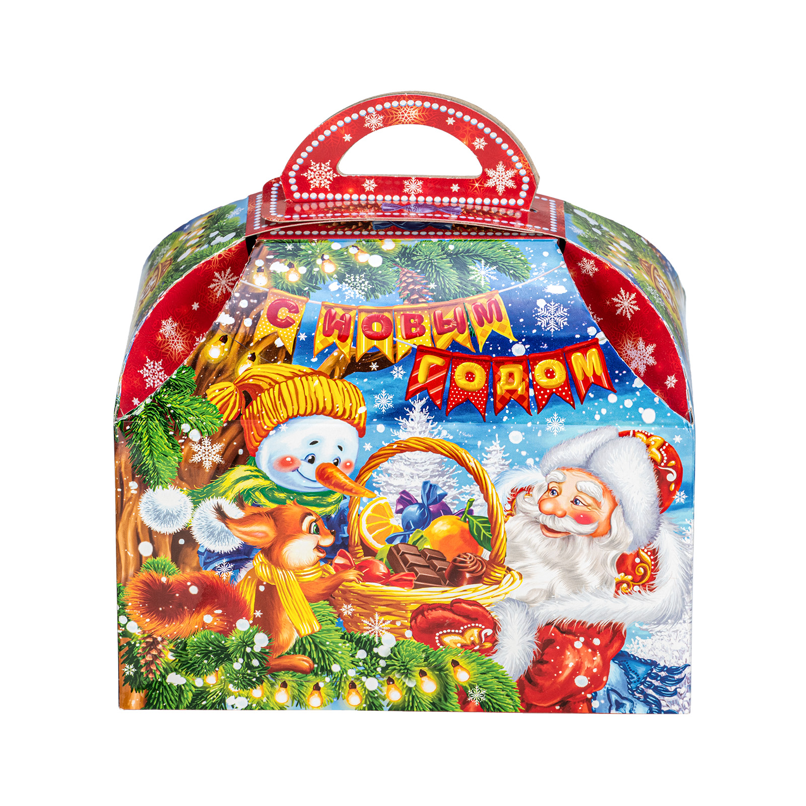 Подарите своим родным и близким безграничную радость вместе с новогодним сладким подарком “Сундук лакомств”. Этот подарочный набор представляет собой небольшую картонную коробочку в форме сундука с удобной ручкой сверху. На упаковке нанесен очень яркий привлекательный рисунок, на котором Дед Мороз и его друзья обмениваются подарками и веселыми улыбками. В состав подарка входит 900 грамм вкусных и разнообразных лакомств от ведущих кондитерских предприятий,  а также небольшой памятный сувенир в виде символа наступающего года.